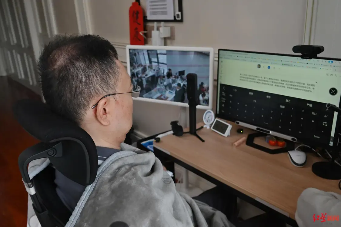 然而,身体的极度困顿,并未冻结他的思维与行动。如今,眼控仪成了蔡磊与世界连接的桥梁。“打字挺快的,一分钟几十个字。”陈女士说,尽管长时间用眼会让蔡磊疲惫不堪,腰部也无法久坐,每工作一两个小时就需休息,但他的思维依旧敏捷,“每天除了休息就是工作,线上科研会议一场不落”。