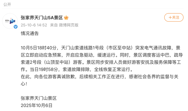 新京报讯 10月6日纵信优配,张家界天门山景区发布情况通告,内容如下: